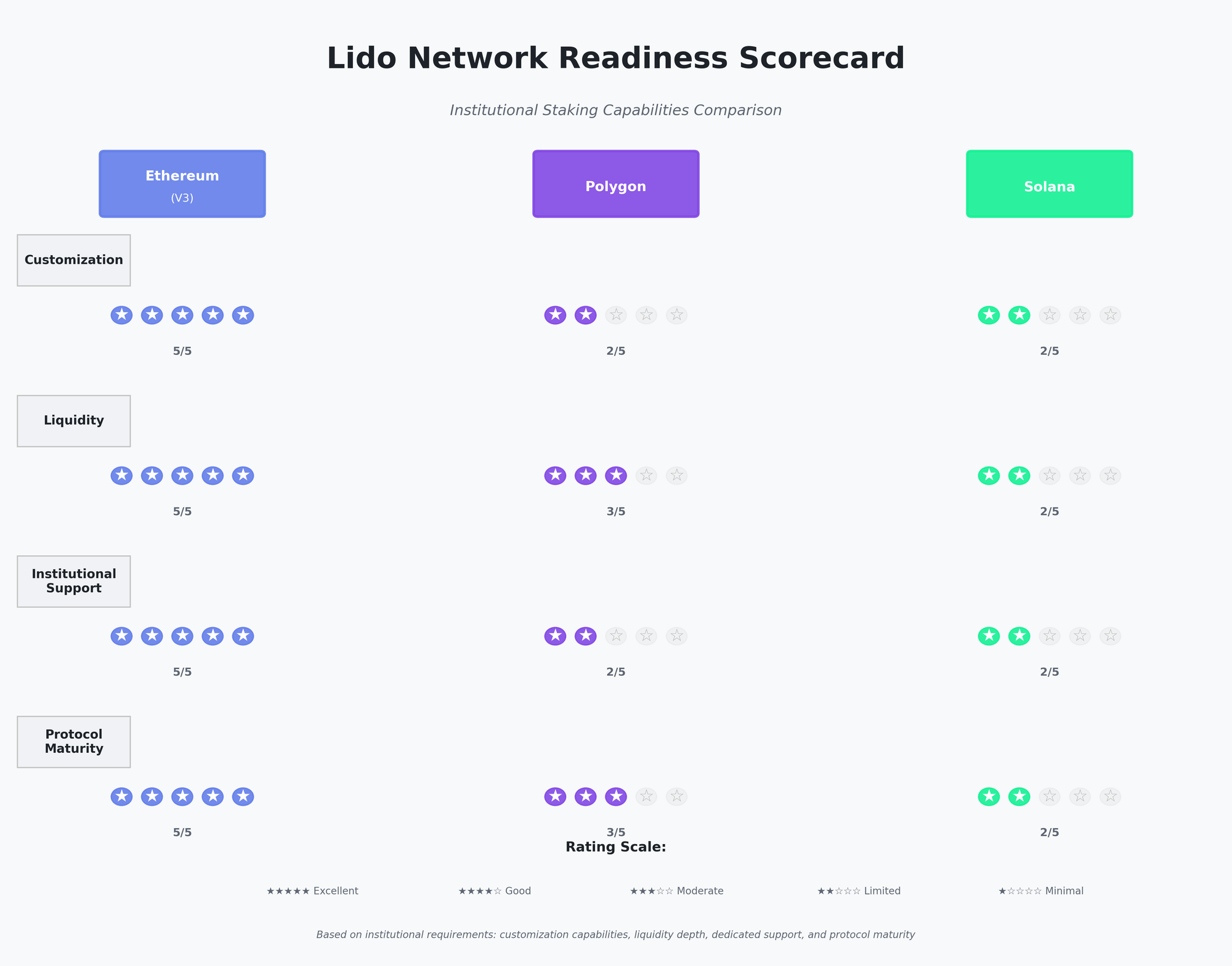 Ethereum with V3's stVaults represents Lido's institutional flagship — mature protocol, customization capabilities, deep liquidity, extensive institutional support infrastructure, and proven track record with large positions. Institutional readiness is excellent across transparency, customization, liquidity, and operational support.