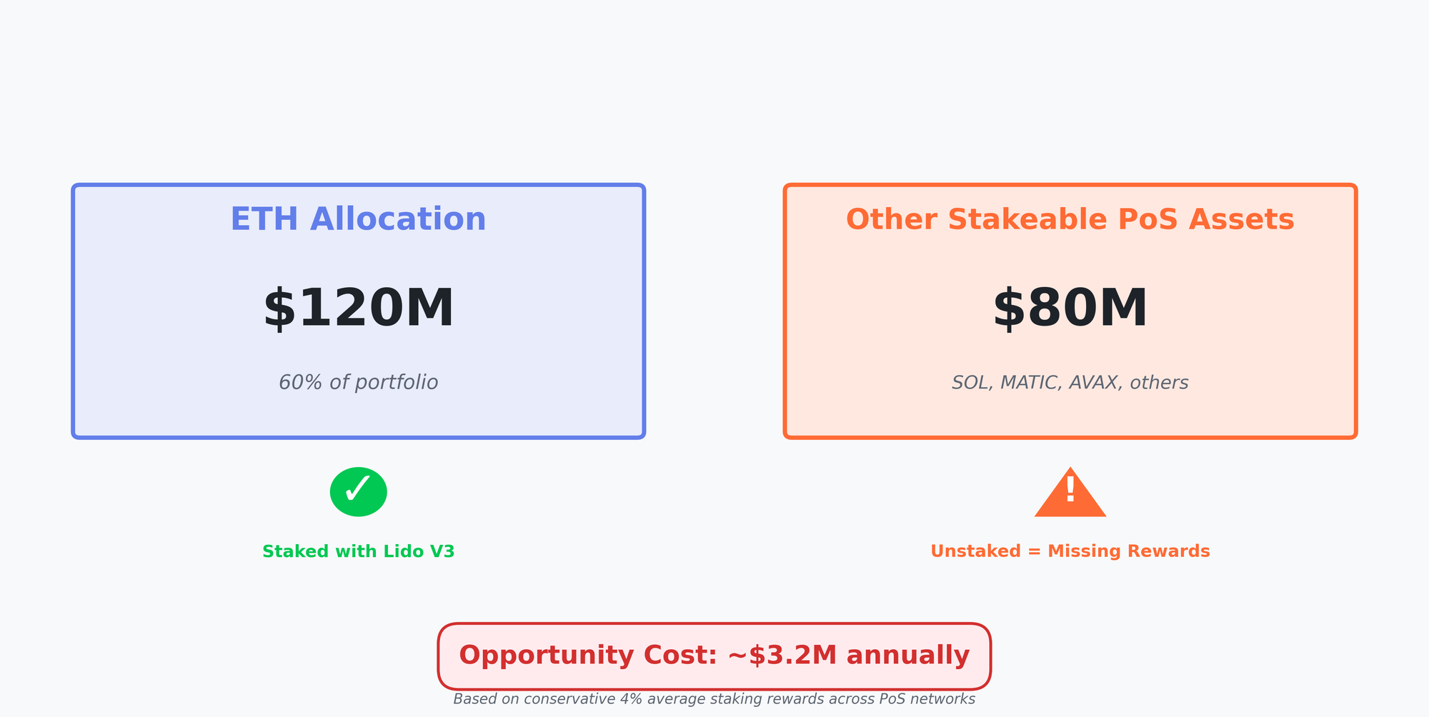 For a $200M portfolio with $50M in unstaked proof-of-stake assets, the opportunity cost approaches $2M annually at a conservative 4% average reward rate. That's not theoretical — it's board-reportable capital sitting unproductive.