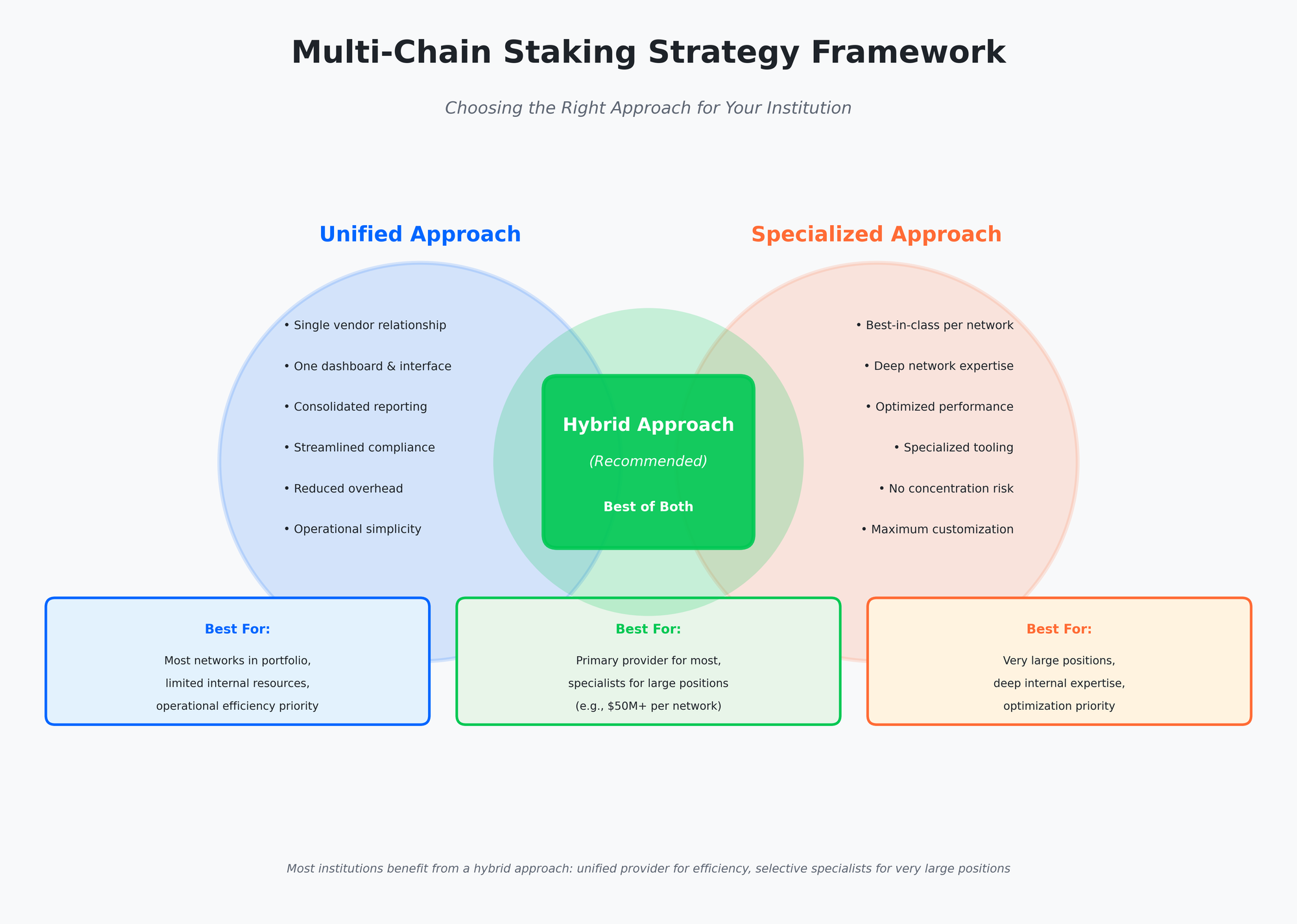 Most institutions benefit from a hybrid approach: Use a capable multi-chain provider as your primary partner for most networks, but selectively use specialists for networks where deep expertise creates meaningful value.