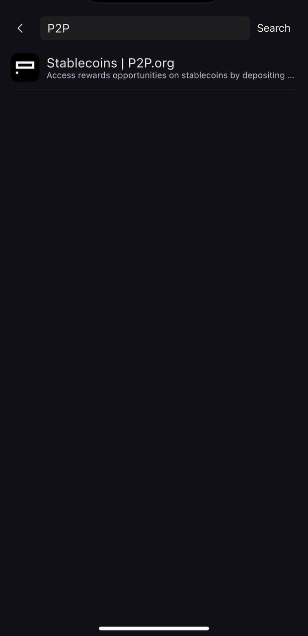 Tap the search icon and type “P2P”.You’ll find Stablecoins | P2P.org listed as one of the Earn dApps.