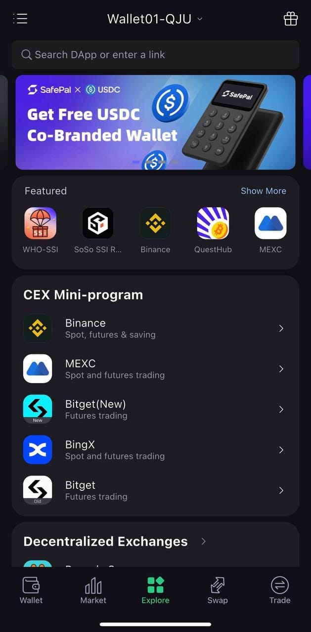 Scroll through or use the search bar to find available dApps in SafePal Earn. You’ll see featured partners like Binance, MEXC, and now P2P.org.
