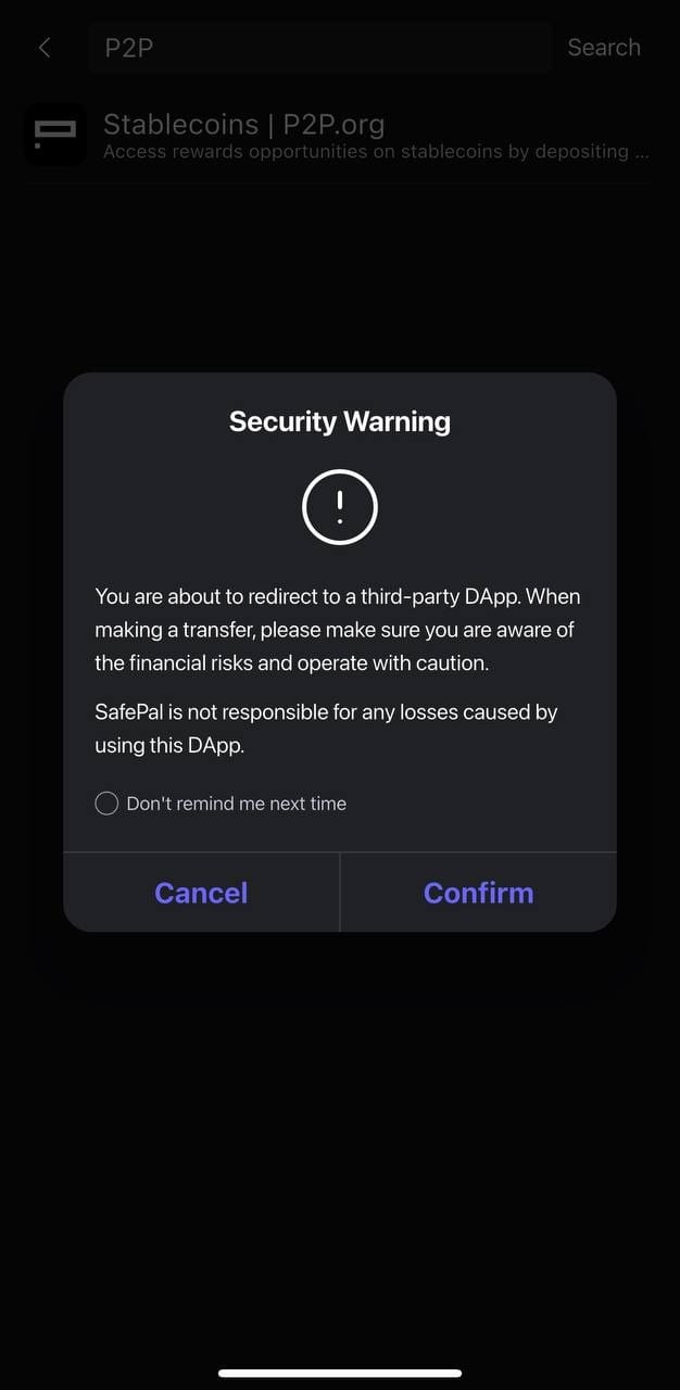 When you tap to open P2P.org, you’ll see a Security Warning — this is standard for all third-party dApps. Confirm to continue.