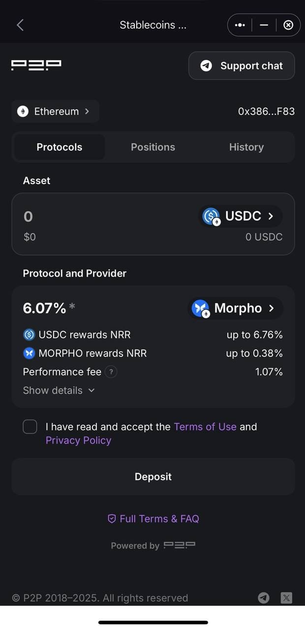 Inside the P2P.org interface, select your asset (USDC, USDT, or DAI) and the protocol you want to allocate to.For example, you can choose Morpho — one of the DeFi protocols available through P2P.org infrastructure.
