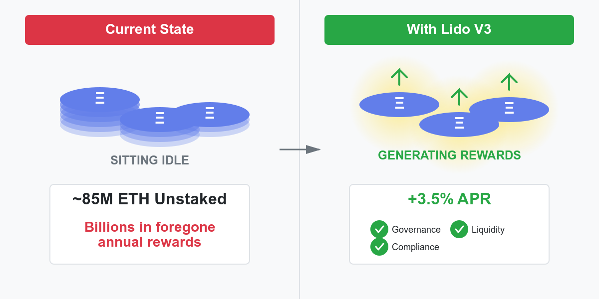 On one side: approximately 85 million ETH sitting unstaked — representing substantial institutional holdings sitting idle. On the other: staking rewards averaging 3-4% APR with institutional-grade security now available. In the middle: a gap where traditional staking solutions simply don't meet institutional requirements.