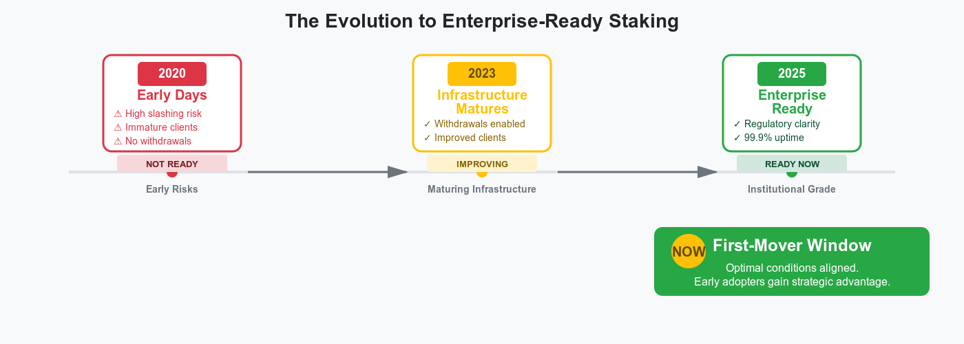 The early days of Ethereum staking featured high slashing rates and operational complexity that made institutional participation impractical. The infrastructure landscape has transformed — client software is mature and battle-tested, professional operators deliver 99.9%+ uptime as standard, sophisticated monitoring prevents incidents, and withdrawal capabilities (enabled in 2023) eliminate forced illiquidity.