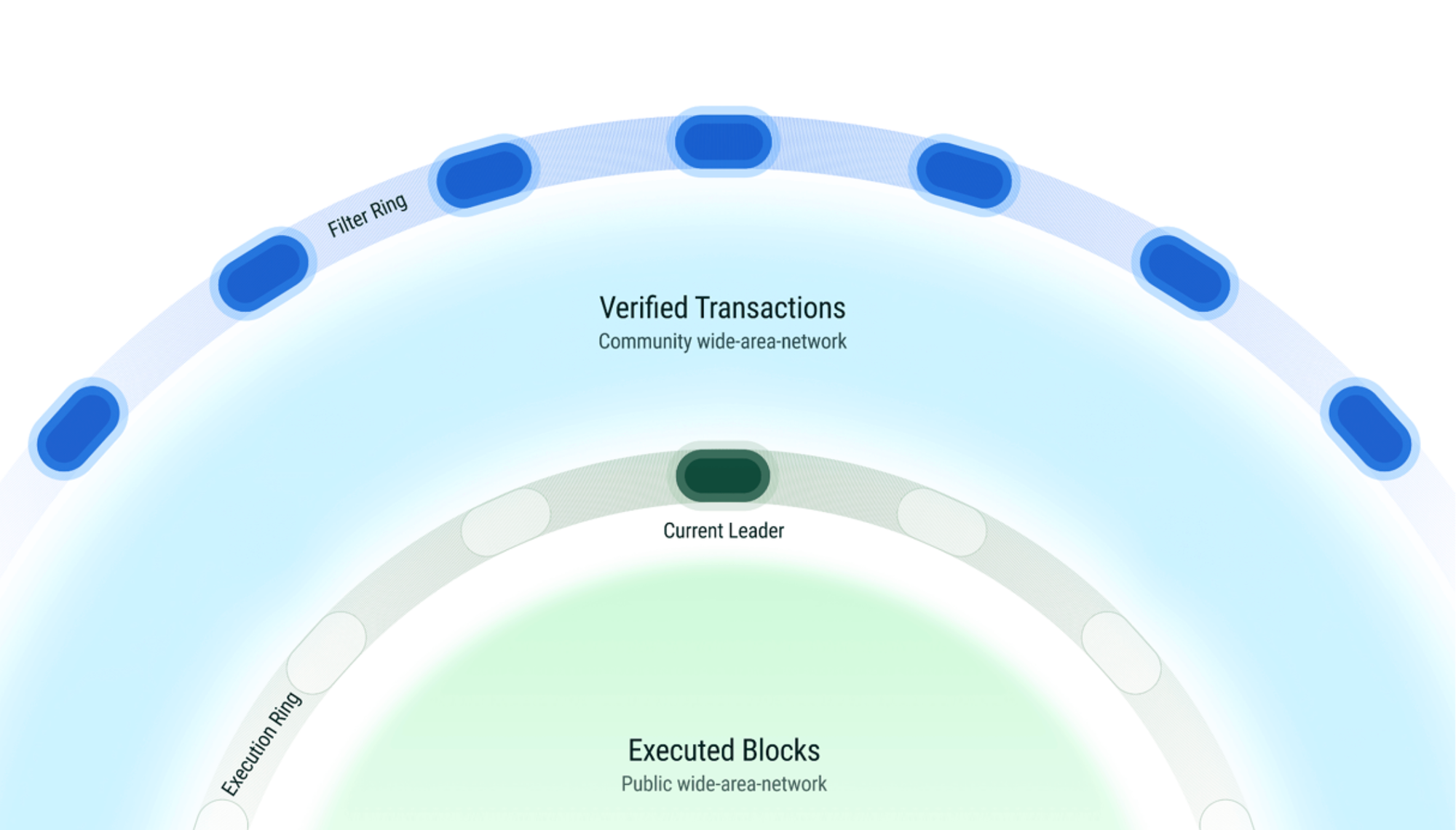 The architecture uses two concentric rings that work together. The outer ring deploys FPGA-powered hardware at key network entry points to filter spam, remove duplicate transactions, and verify signatures before data ever reaches validators. The inner ring provides dedicated fiber optic routes for block propagation and consensus — delivering low latency, high bandwidth, and minimal jitter.