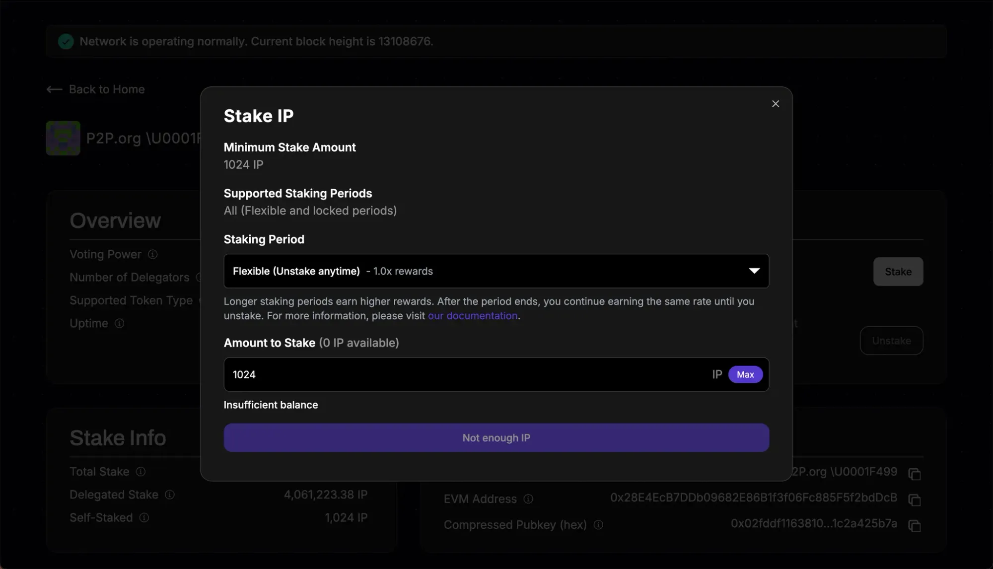 Once connected, you’ll see your available $IP balance and your current staking status.